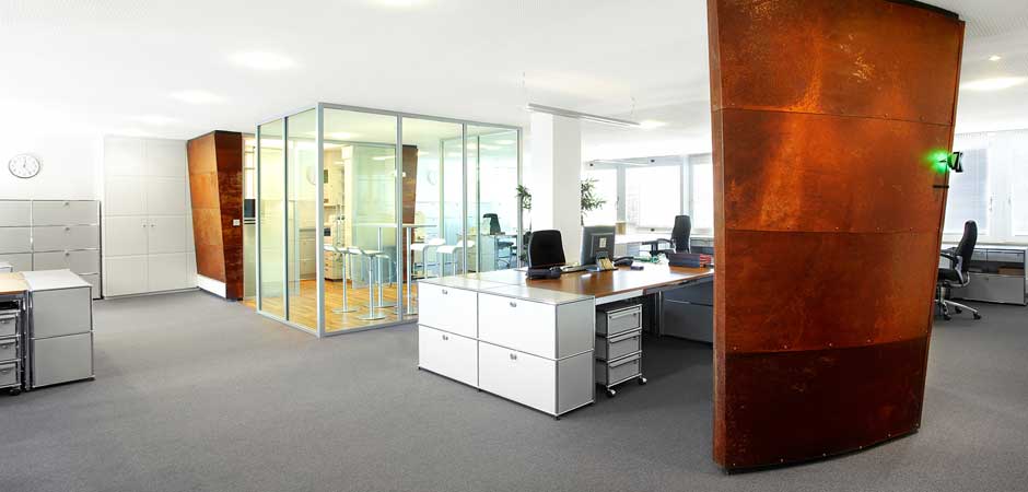Flure wurden aufgehoben und durch neue „Plätze” und „Meeting Points” ersetzt. Die Raumorganisation der loftartigen Bürolandschaft basiert auf einem 3-achsigen Aufbau, der durch den dekorativen Charakter eines Schiffsrumpfes in der Mitte gegliedert wird. Oxidierte Cortenstahlplatten wurden bewusst in Ihrer rauen und derben Struktur als optischer Gegenpol zur glatten und sehr klaren, schlichten Glas-Alu-Architektur platziert.
